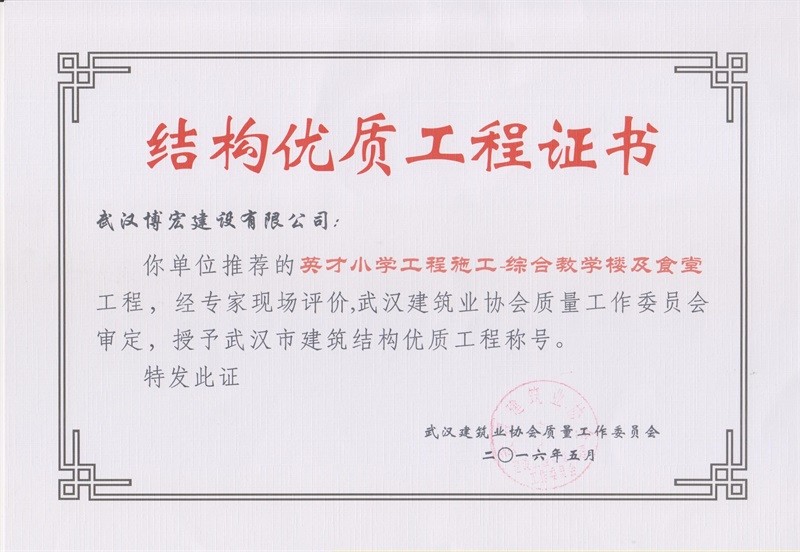 英才小學-綜合教學樓及食堂結(jié)構(gòu)優(yōu)質(zhì)工程證書