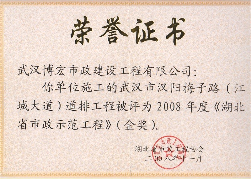 2008年度湖北省市政示范工程金獎(梅子路道排工程)