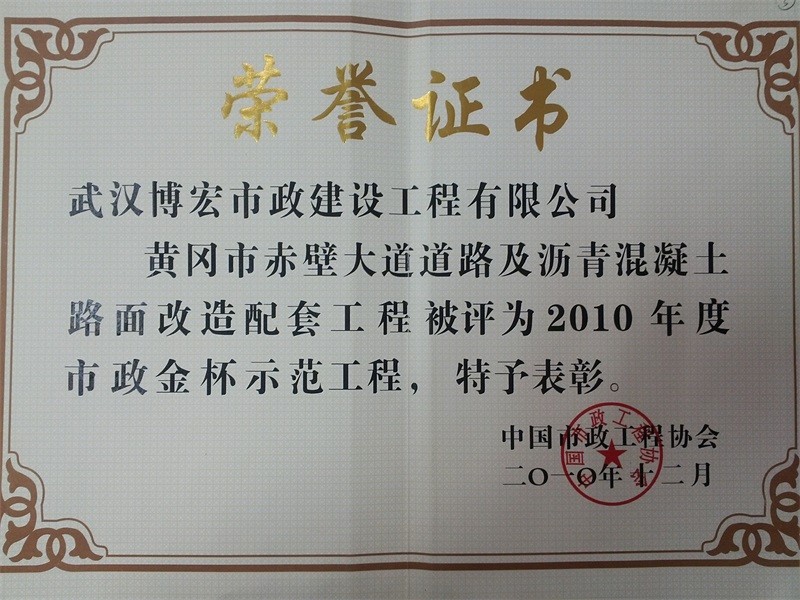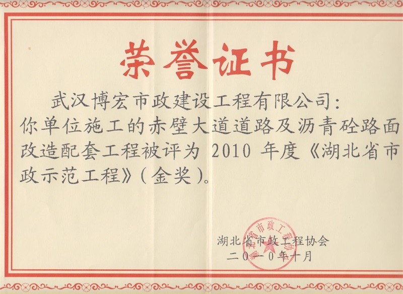 2010年度湖北省市政示范工程金獎(赤壁大道道路及瀝青砼路面改造配套工程)