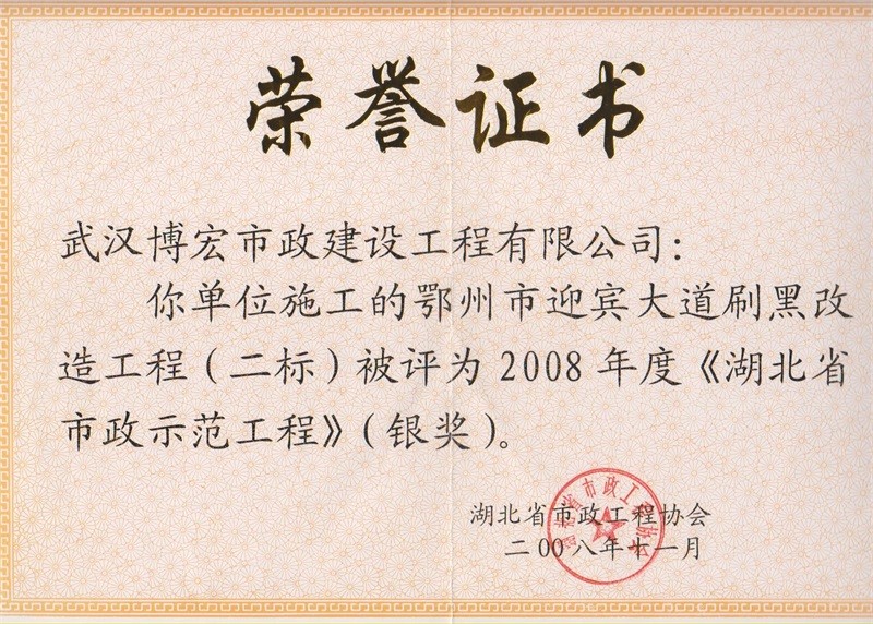 2008年度湖北省市政示范工程銀獎(鄂州市迎賓大道刷黑改造工程二標(biāo))