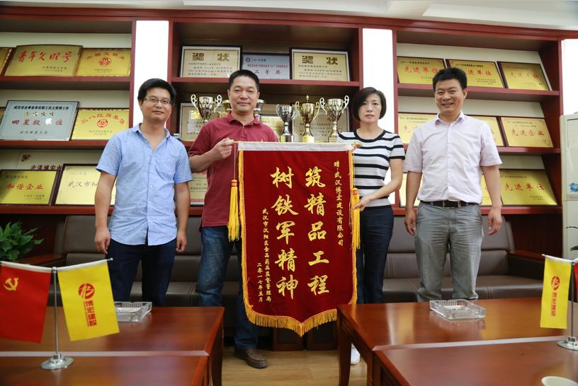 努力成就未來(lái),精品贏得榮譽(yù)!6月14日,因金龍公館4-7樓裝修改造工程建設(shè)又快又好,漢陽(yáng)區(qū)食品藥品監(jiān)督管理局辦公室主任馬濤專程到訪博宏建設(shè),送來(lái)錦旗一面表示感謝!