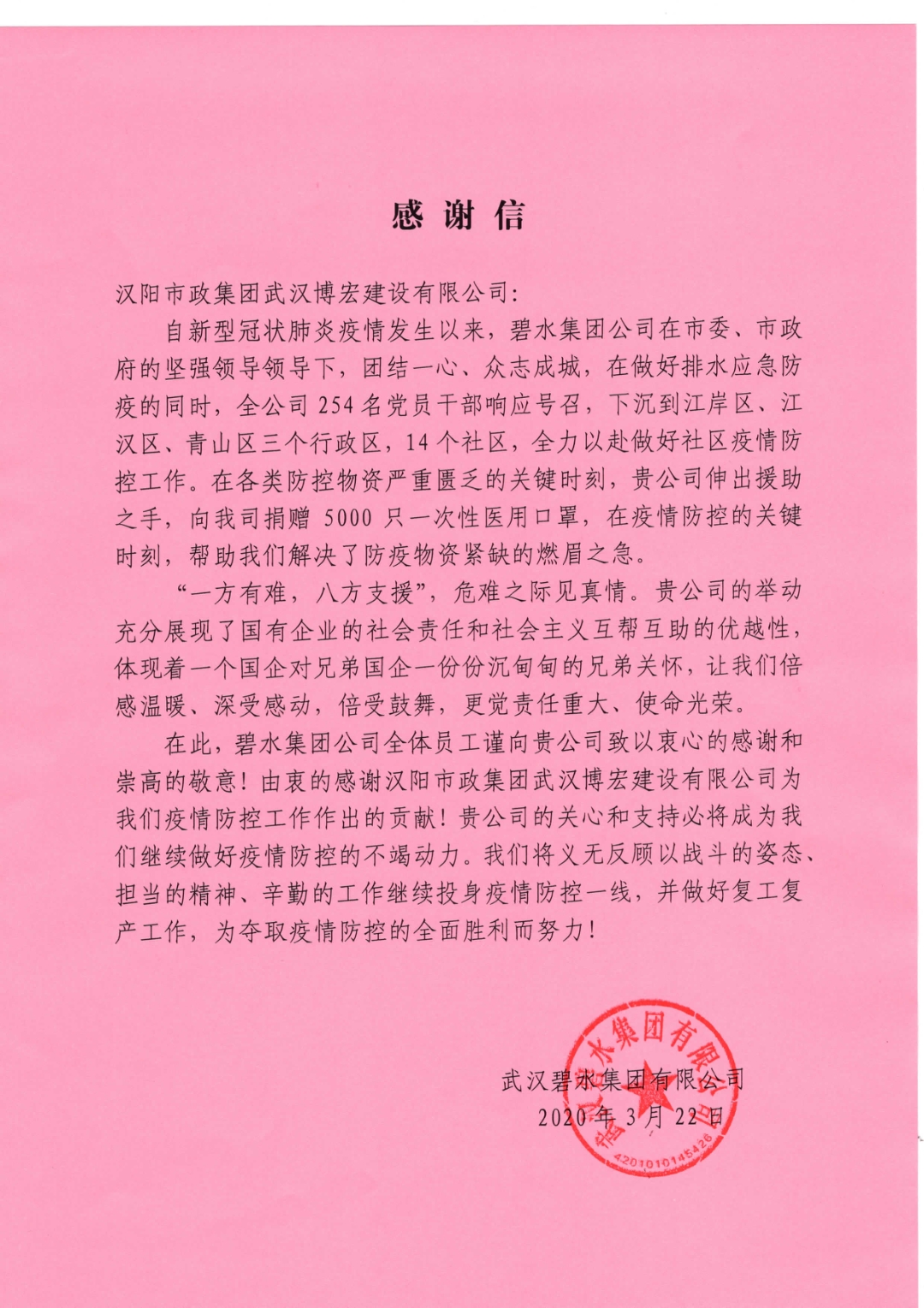 近日,博宏建設(shè)收到一封來自武漢碧水集團(tuán)的一封感謝信。信中表達(dá)了對博宏建設(shè)在疫情期間解決一線物資燃眉之急所做出的努力。