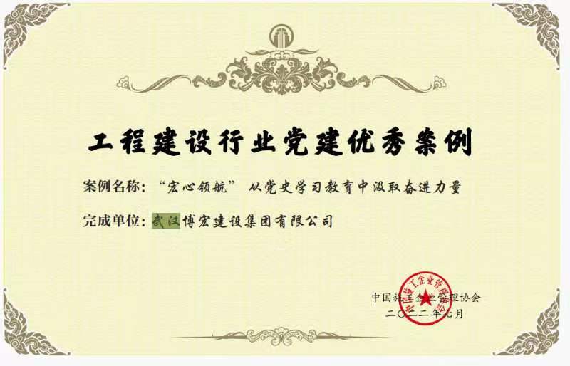 近日,中國(guó)施工企業(yè)管理協(xié)會(huì)發(fā)布文件,公布了工程建設(shè)企業(yè)黨建工作最佳案例、優(yōu)秀案例,由博宏建設(shè)集團(tuán)申報(bào)的““宏心領(lǐng)航”,從黨史學(xué)習(xí)教育中汲取奮進(jìn)力量”獲優(yōu)秀案例榮譽(yù)。