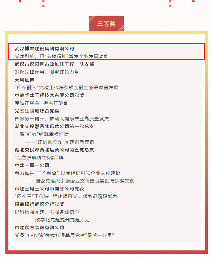 ? ? ? ?近日,首屆新時代企業(yè)黨建創(chuàng)新案例獲獎名單公布,由博宏建設(shè)集團(tuán)推送的《黨建引航,用“勞模精神”激發(fā)企業(yè)發(fā)展動能》品牌案例斬獲黨建優(yōu)秀案例三等獎。?該項活動由湖北省新時代文明實踐研究院、華中科技大學(xué)馬克思主義學(xué)院、華中科技大學(xué)黨的建設(shè)研究中心聯(lián)合紅艦智庫等機(jī)構(gòu)共同發(fā)起,博宏建設(shè)集團(tuán)推送的品牌案例在百余項案例中脫穎而出。