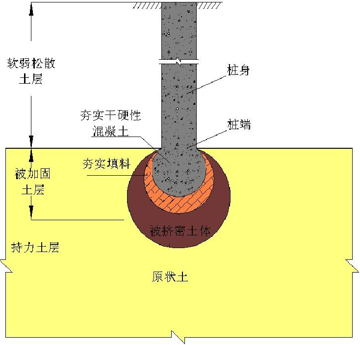 “載體樁”由上部樁身和下部“復(fù)合載體”兩部分組成。樁身一般為現(xiàn)澆鋼筋混凝土結(jié)構(gòu),“復(fù)合載體”是位于樁端底部、經(jīng)深層填料夯實(shí)的復(fù)合體。