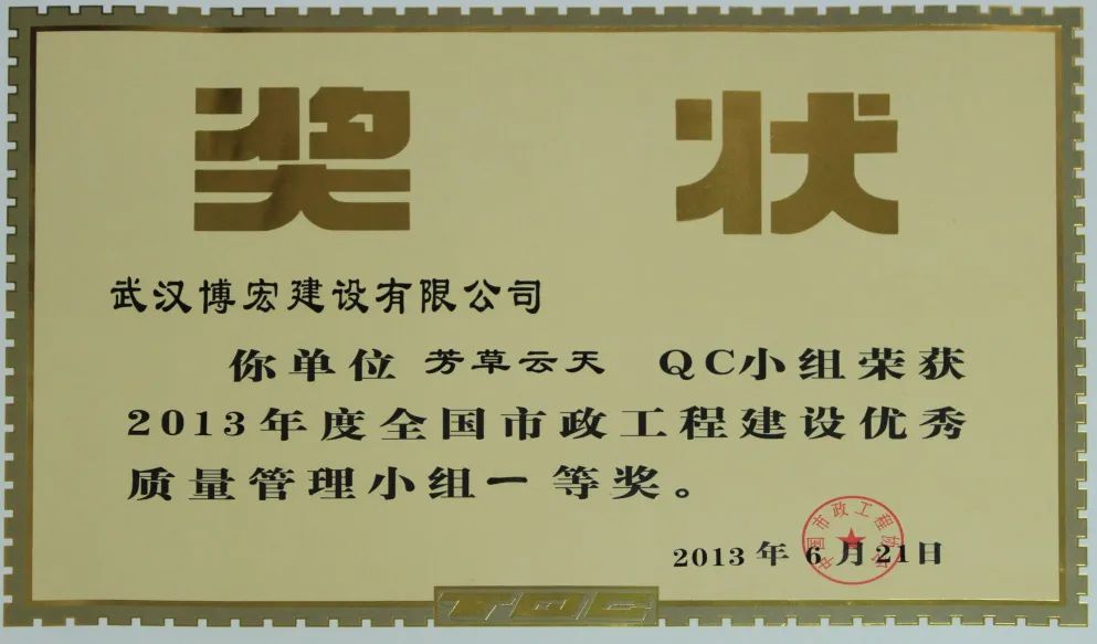 芳草云天QC小組成立于2011年5月31日,本小組從企業(yè)經營戰(zhàn)略、方針目標和現場存在的問題出發(fā),以提高效能、降低消耗、實現經濟與社會效益雙贏為目的,全面優(yōu)化項目質量。歷年來追求卓越、探索新品,曾獲得2013 年全國市政工程建設協(xié)會優(yōu)秀QC成果一等獎、2014年湖北省市政工程建設優(yōu)秀QC成果二等獎、2015年湖北省市政工程建設優(yōu)秀 QC成果一等獎、2022年度中國施工企業(yè)管理協(xié)會工程建設質量管理小組活動成果二等獎、2022年中國建筑業(yè)工程建設質量管理小組活動成果三等獎等榮譽。