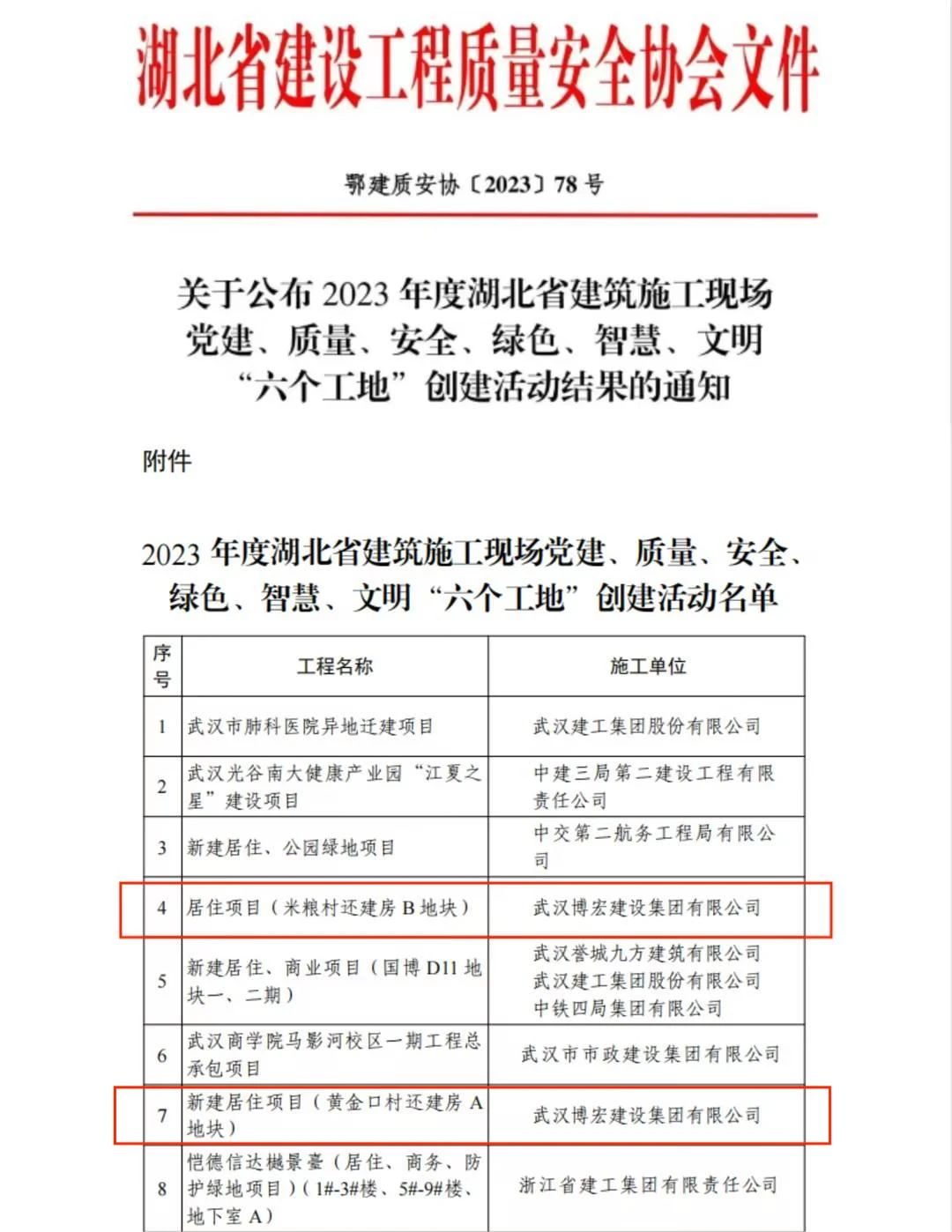 近日,湖北省建設(shè)工程質(zhì)量安全協(xié)會公布了2023年度湖北省建筑施工現(xiàn)場黨建、質(zhì)量、安全、綠色、智慧、文明“六個工地”評比結(jié)果名單,由博宏建設(shè)集團(tuán)承建的居住項(xiàng)目(米糧村還建房B地塊)、新建居住項(xiàng)目(黃金口村還建房A地塊)喜獲殊榮。