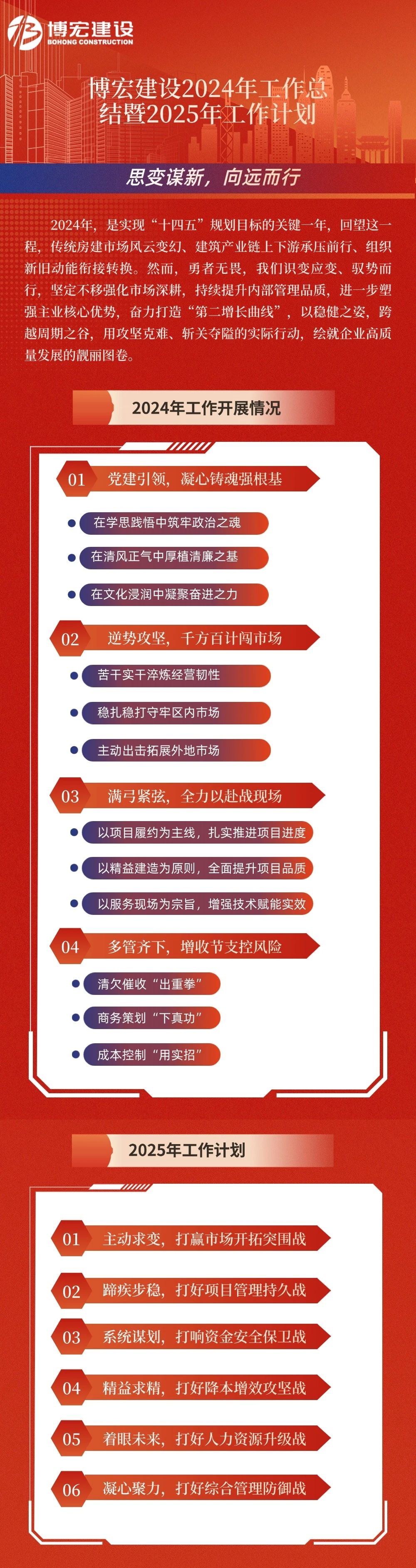 1月24日-25日,博宏建設(shè)2024年度總結(jié)表彰暨2025年工作研討會(huì)順利召開。公司黨委班子、部門負(fù)責(zé)人、項(xiàng)目經(jīng)理和員工代表共80余人參加會(huì)議。集團(tuán)黨委書記嚴(yán)悌文、董事長(zhǎng)虞志鵬、常務(wù)副總經(jīng)理錢濤受邀出席會(huì)議。會(huì)議由公司黨委副書記郭一清主持。